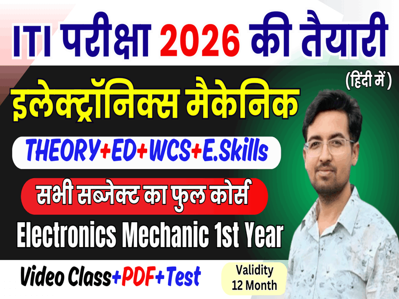 इस कोर्स में आपको प्रथम वर्ष के सभी सब्जेक्ट के विडियो क्लास + सभी सब्जेक्ट के आनलाइन टेस्ट सीरीज मिलेग। पूरा कोर्स हिंदी में पढाया गया है। 1- Electronic Theory Recorded Class 2- Employability Skills Live Class 3- Engineering Drawing Recorded 4- Workshop Calculation Recorded फ्री क्लासेज देखने के बाद ही कोर्स ज्वाइन कीजिये, क्यों की कोर्स ज्वाइन करने के बाद फीस वापस करने की सुविधा उपलब्ध नही है Course Language- Hindi